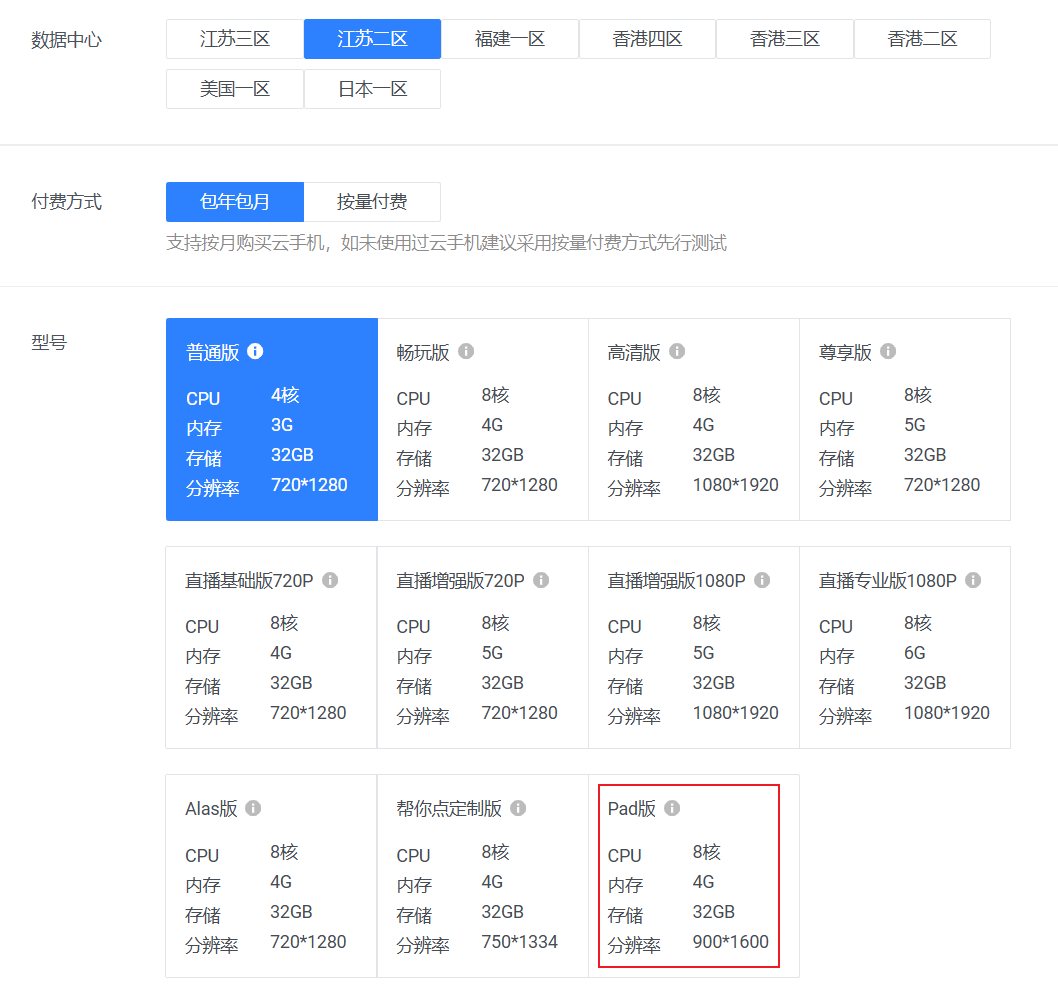 首先购买一台型号是Pad版的云手机;