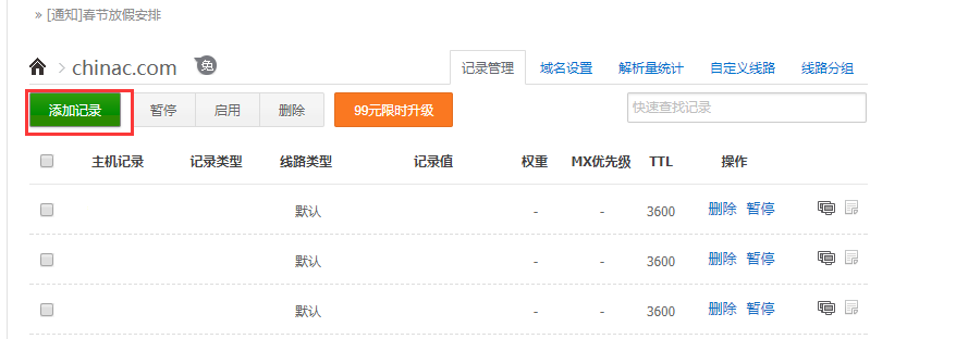 - 进入到 域名解析 平台,登陆dnspod平台后,点击 域名解析,然后点击所申请证书的域名。(此处以dnspod平台为例,以申请的主域名为www.demo.com为例)